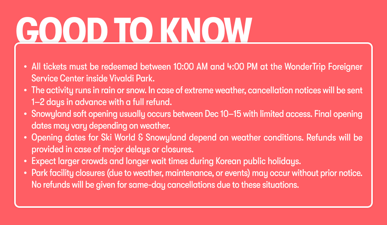 Enjoy winter fun at Sono Vivaldi Park – one of Korea’s most popular ski resorts! Choose from ski lift passes with full equipment rental, or visit Snowyland, a magical snow playground perfect for families and non-skiers. Flexible options for weekdays or weekends, with gear and access included!