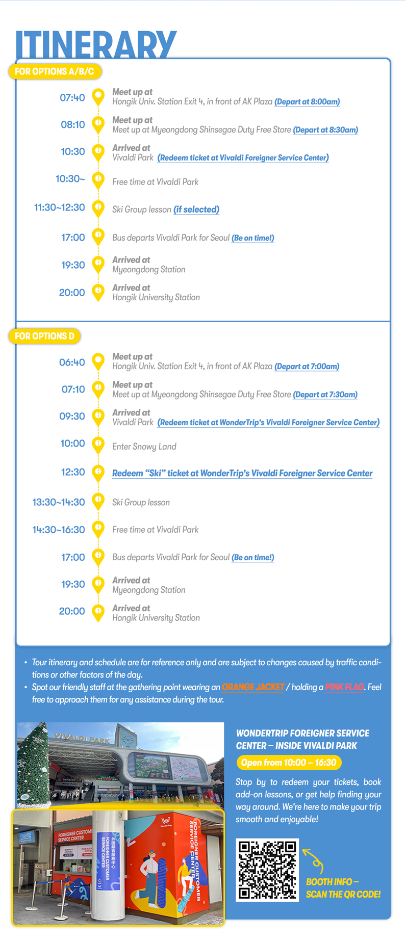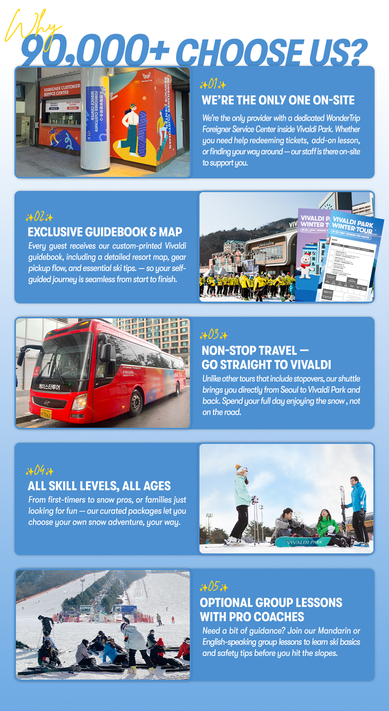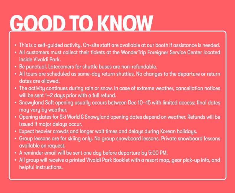 Experience Winter Snow Fun with Official Vivaldi Park Access Your Winter Adventure at Vivaldi Park Starts Here! Join over 90,000 travelers who trusted WonderTrip to explore Korea’s most-visited ski resort. Looking for the ultimate winter escape? The Vivaldi Park Official Ticket Package is your all-in-one pass to skiing, snowboarding, Snowyland fun, and a hassle-free round-trip shuttle from Seoul—now offered as a fully self-guided experience. Make memories in Korea’s winter wonderland—ski, sled, or simply soak in the snowy view. Book your official access today and enjoy winter, your way!