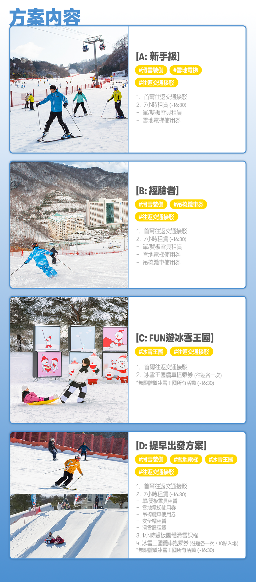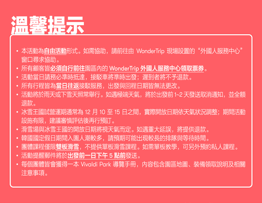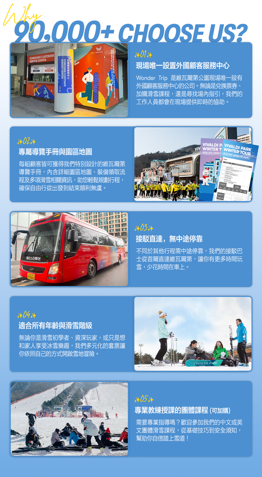 在維瓦爾第度假村展開您的冬季冒險! 加入超過9萬名旅客的行列,信賴 WonderTrip 帶您探索韓國最受歡迎的滑雪勝地。 想找個完美的冬季假期嗎?維瓦爾第度假村官方票券套票,讓您一次暢玩滑雪、滑雪板、冰雪樂園,還能享受從首爾出發的輕鬆來回接駁,現在更提供完全自助的體驗! 在韓國的冬季仙境中創造美好回憶——滑雪、滑雪橇,或只是沉浸在雪景中。 今天就預訂官方通行證,用你的方式盡情享受冬季!