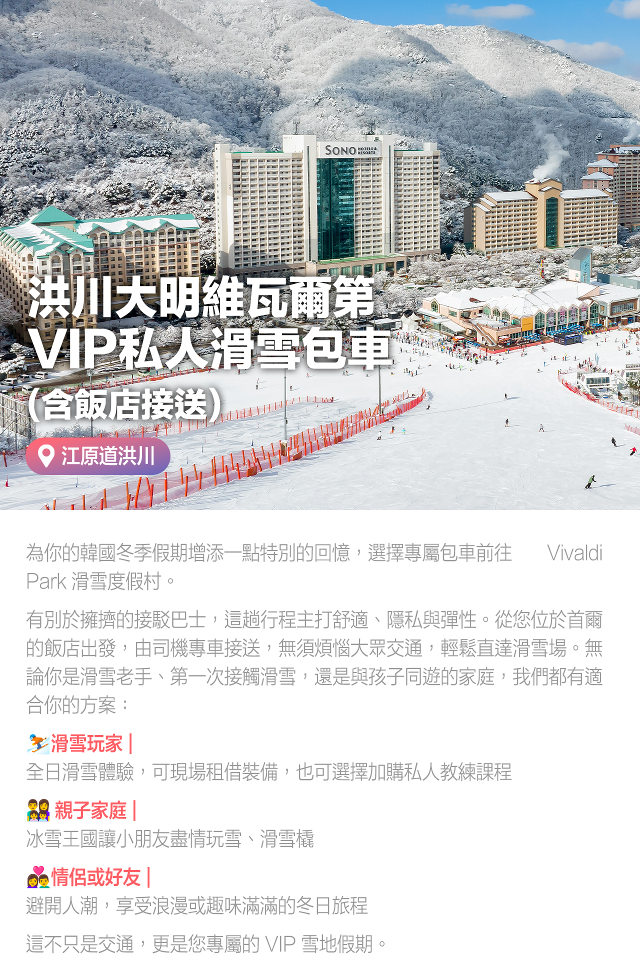 包車前往維瓦爾第度假村,讓您的韓國冬季假期更加特別!告別擁擠的接駁巴士,享受舒適、私密又彈性的旅程。從首爾飯店接駁直達度假村,享受順暢又舒適的旅途。 無論您是滑雪高手、新手,或是親子家庭,我們都為您量身打造了專屬方案: